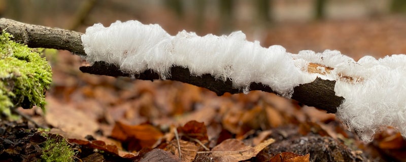 Het water dat uit het hout wordt geduwd, bevriest langzaam bij contact met de koude lucht. De schimmel voorkomt dat het ijs direct samenklontert tot een massieve laag, waardoor het zijn fijne, haarachtige structuur behoudt.